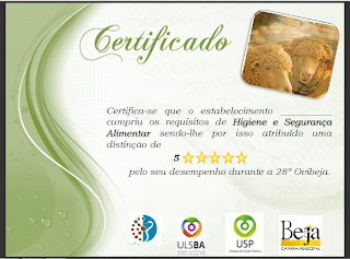 No final destas vistorias, decidimos atribuir um diploma de mérito ao expositor que cumprisse e desenvolvesse as melhores práticas de higiene e segurança alimentar durante a presença na 28º Ovibeja. Esse expositor foi então presenteado com um diploma entregue pela unidade local de saúde publica e pela câmara municipal de Beja.